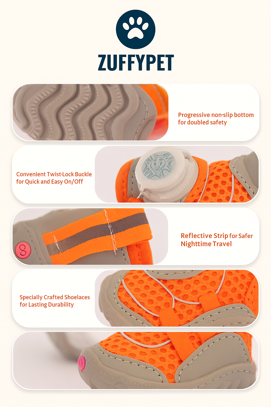 Keep your furry friend’s paws protected and stylish with ZuffyPet Adjustable Dog Shoes! 🐾 Designed for comfort and safety, these lightweight, breathable mesh shoes feature non-slip soles for traction, a reflective strip for nighttime walks, and an easy twist-lock buckle for a snug fit. Perfect for all seasons — protecting paws from heat, cold, and rough surfaces. Ideal for small and medium dogs.